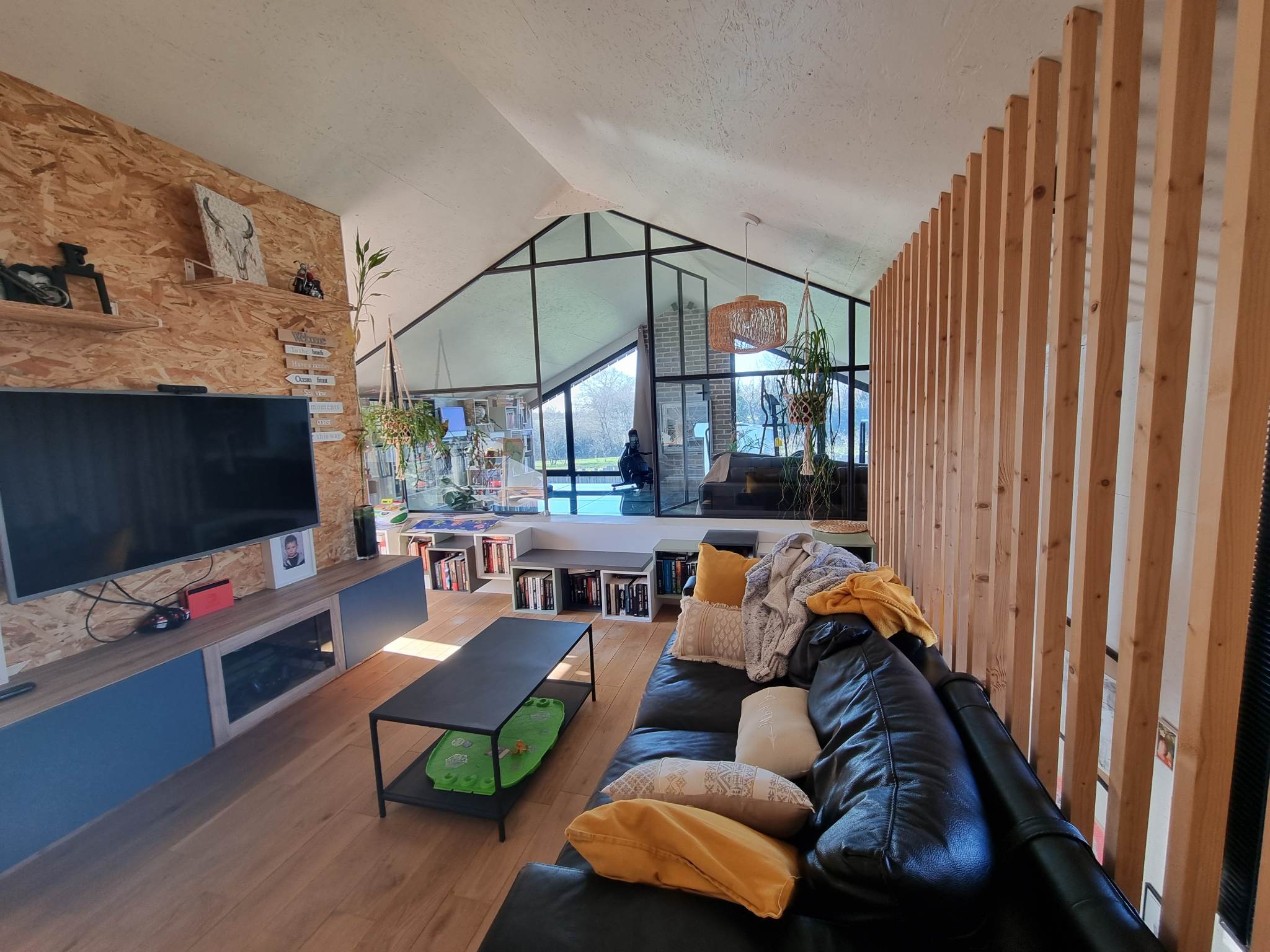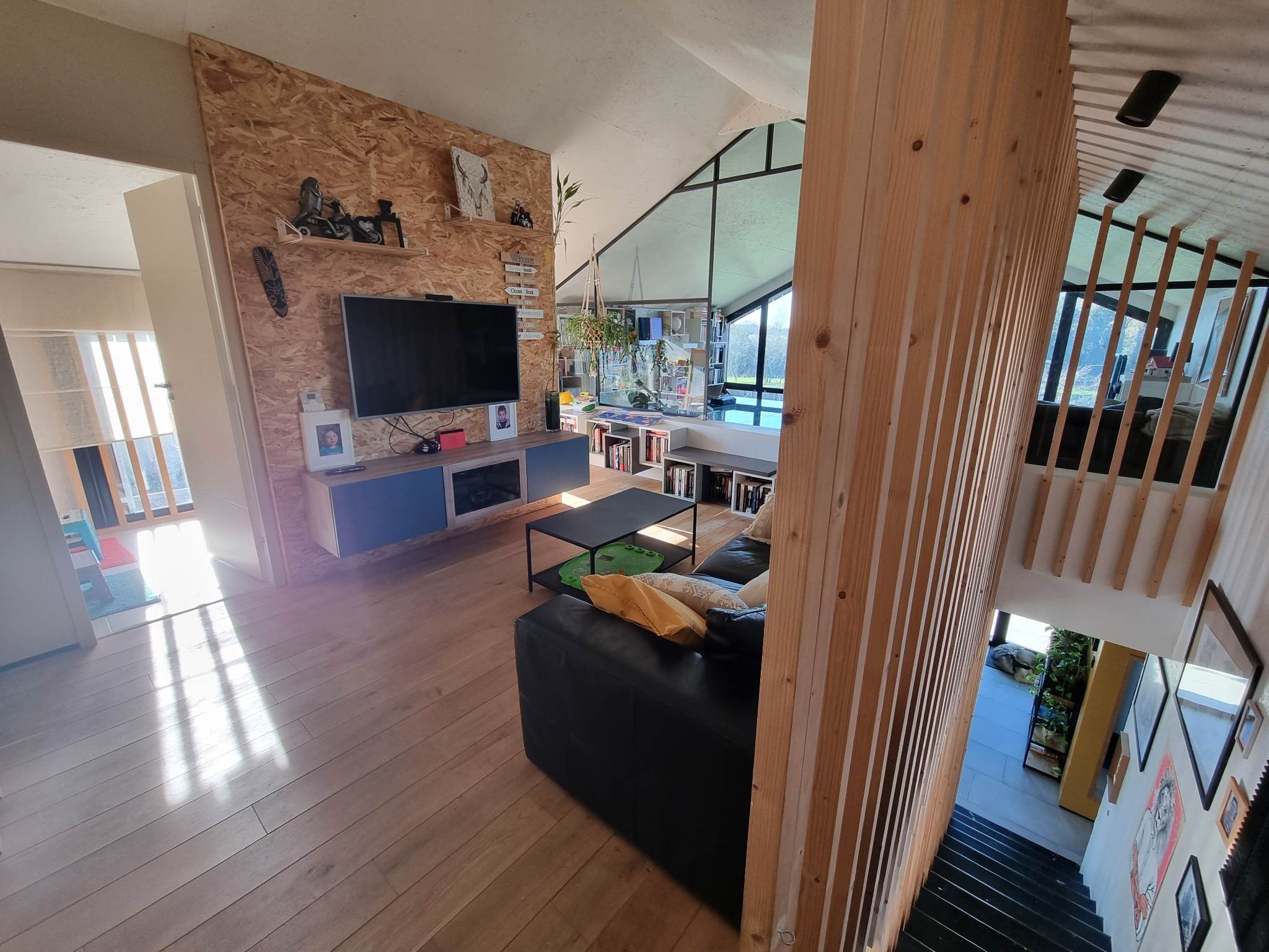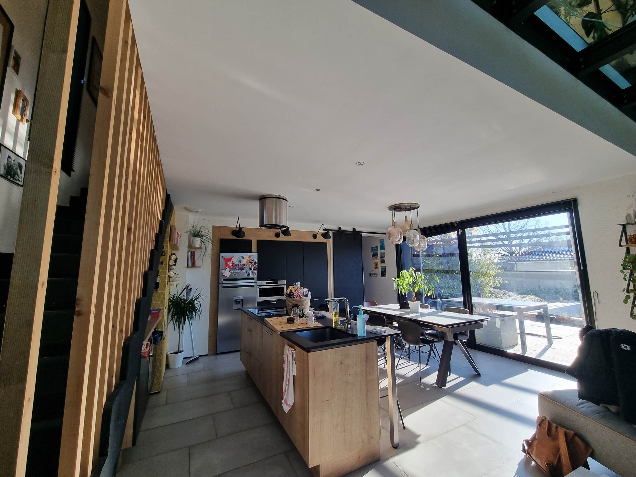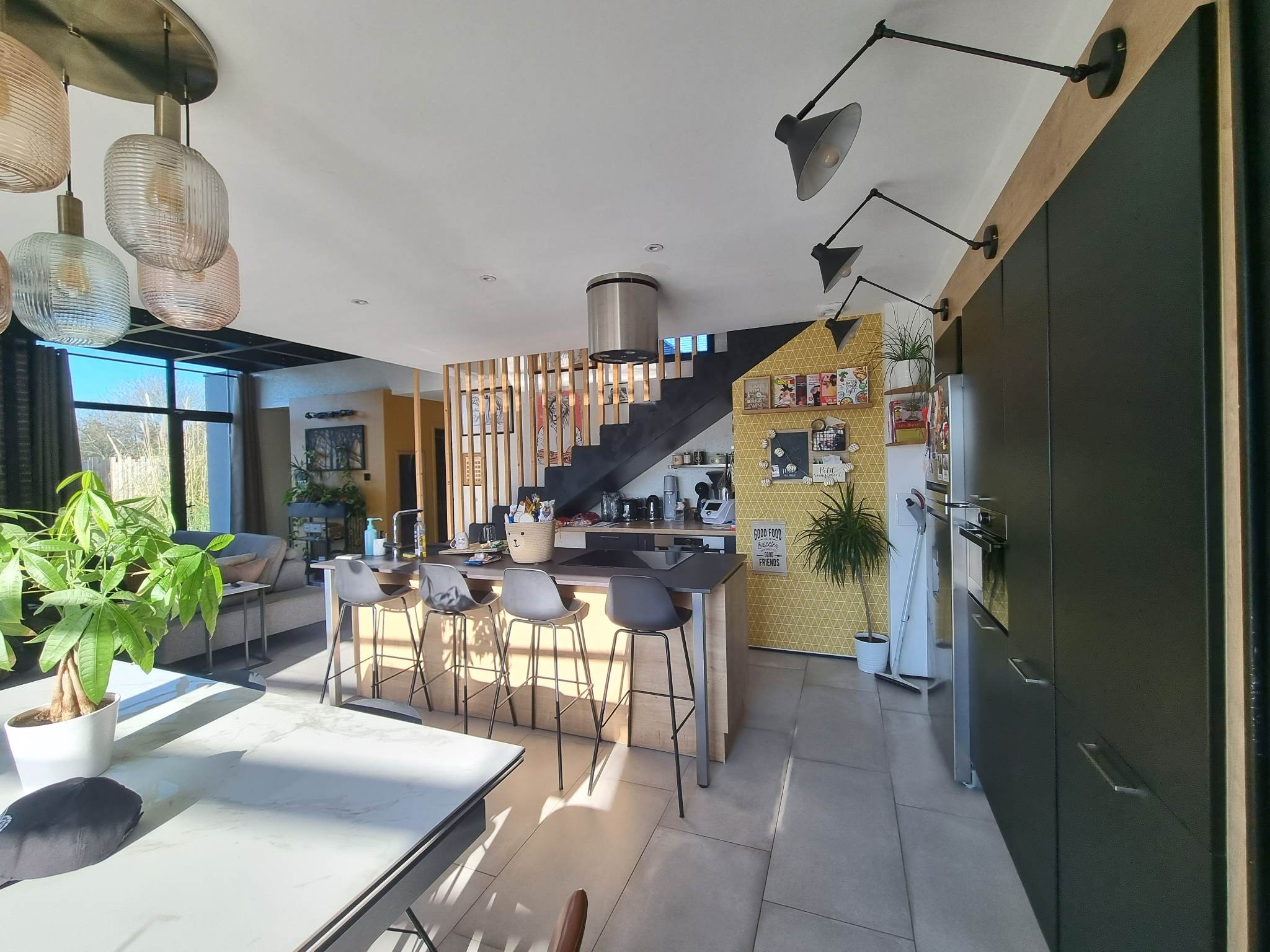 Derrière son volume mêlant bardage bois et larges surfaces vitrées, la maison révèle dès l’entrée une superbe pièce de vie. Baignée de lumière grâce à un plafond de verre et de vastes baies toute hauteur, elle profite d’une atmosphère agreable, chaude et évolutive. Les matériaux dialoguent avec subtilité : mur en briques à l’esprit atelier, métal apparent, teintes douces et finitions soignées.
