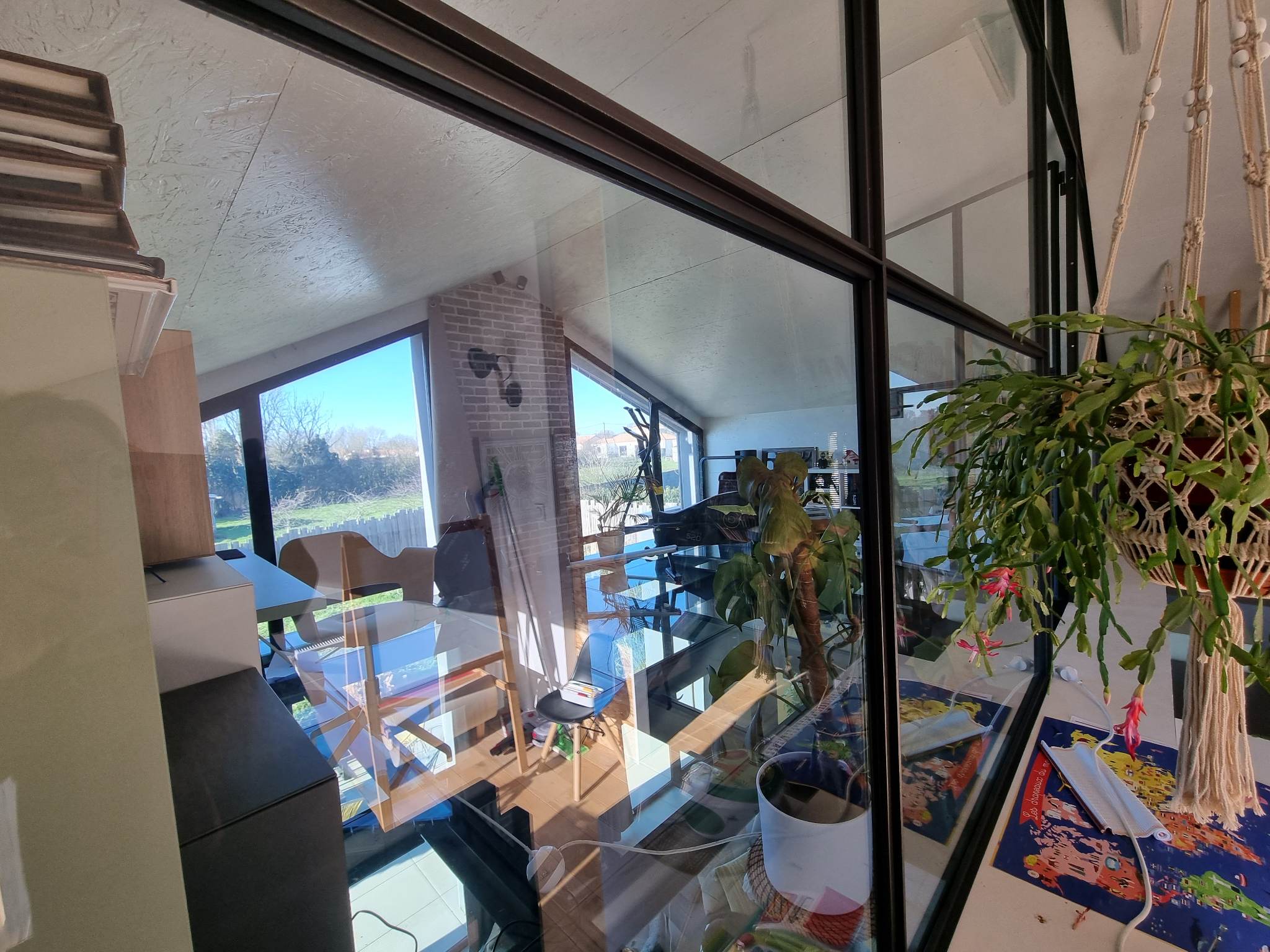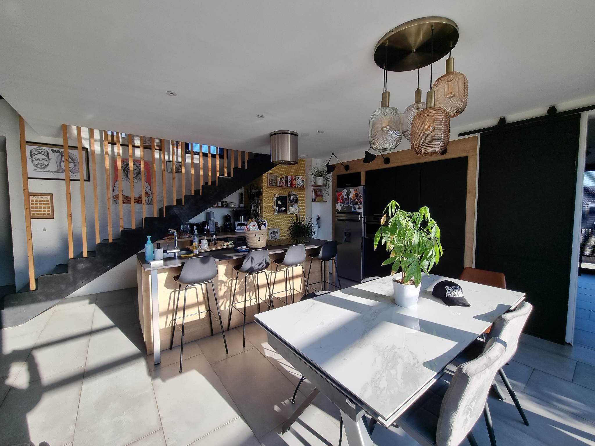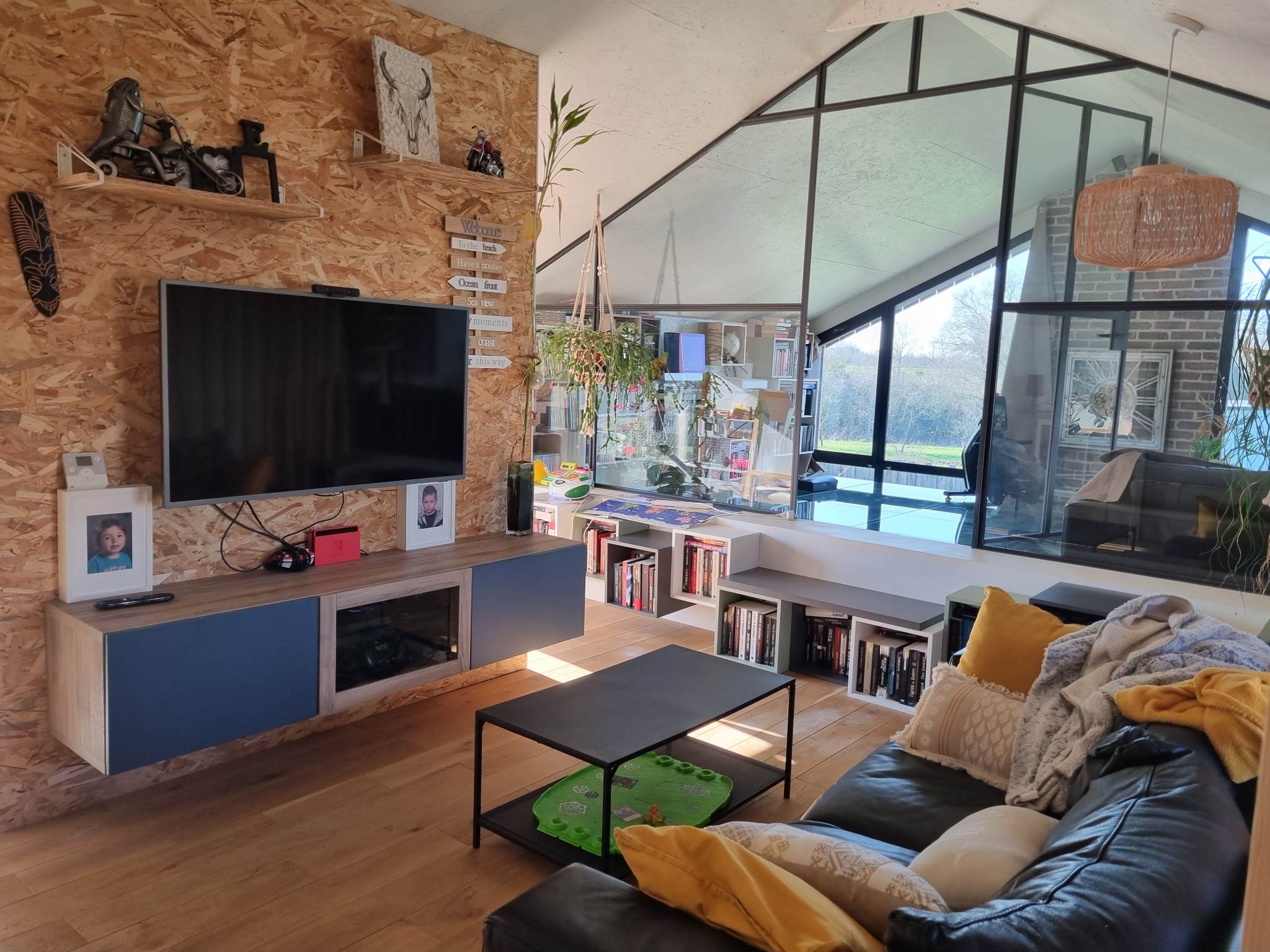 Derrière son volume mêlant bardage bois et larges surfaces vitrées, la maison révèle dès l’entrée une superbe pièce de vie. Baignée de lumière grâce à un plafond de verre et de vastes baies toute hauteur, elle profite d’une atmosphère agreable, chaude et évolutive. Les matériaux dialoguent avec subtilité : mur en briques à l’esprit atelier, métal apparent, teintes douces et finitions soignées.