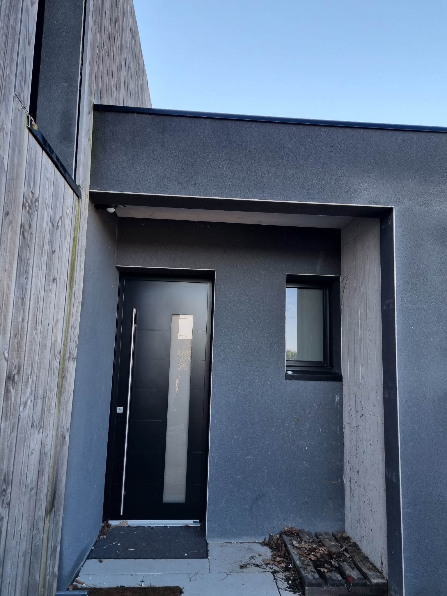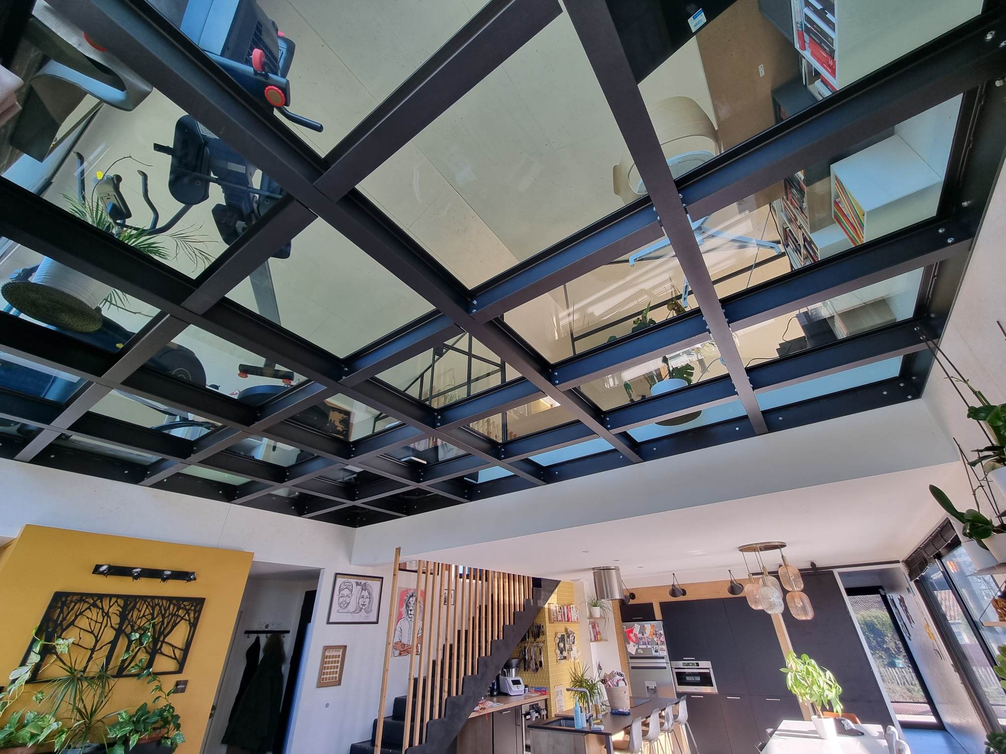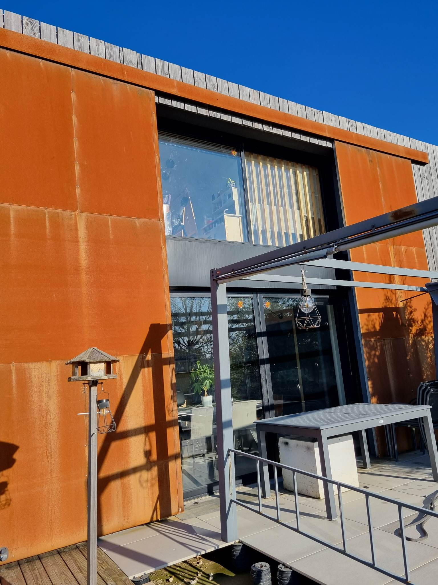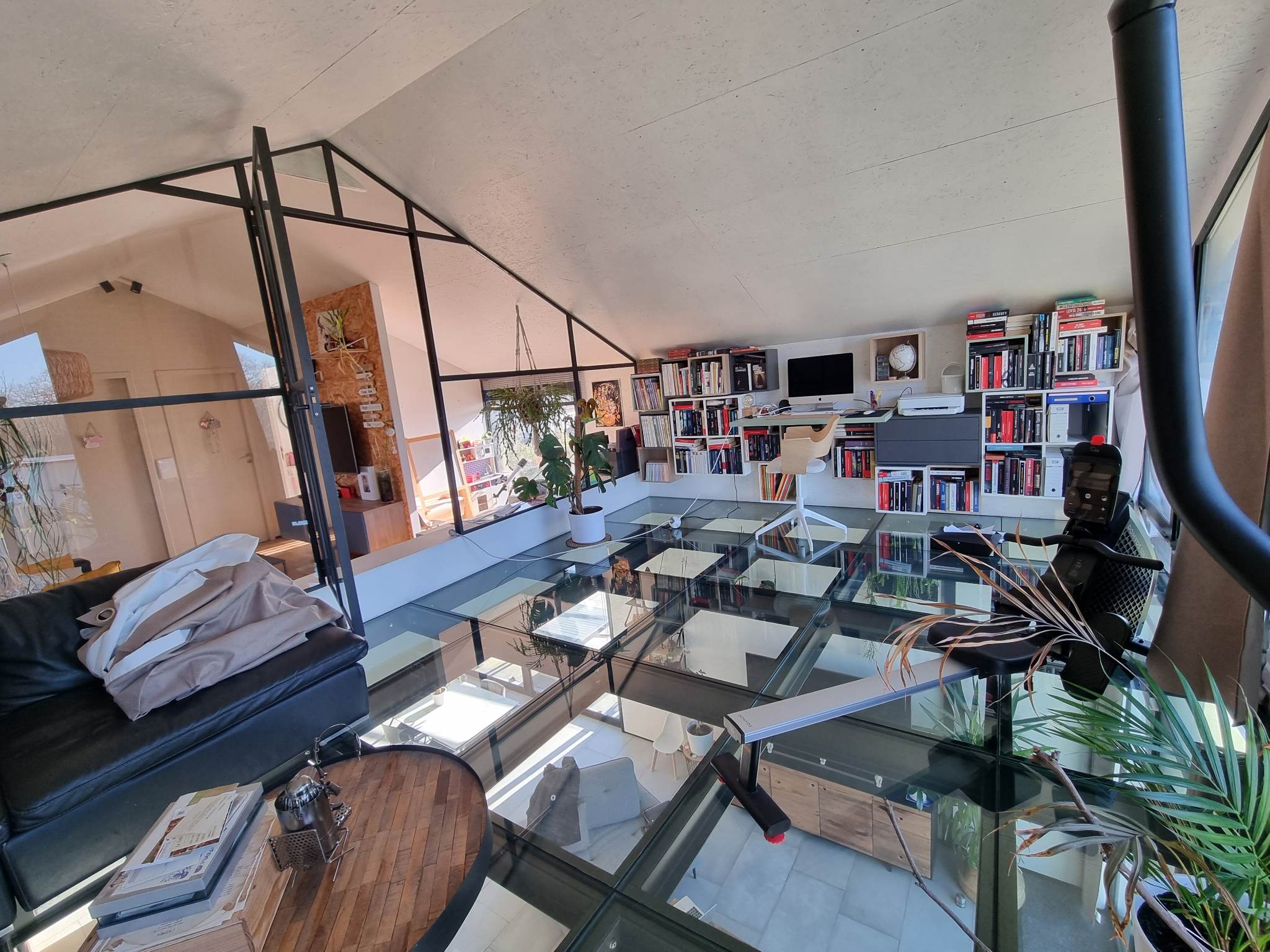 Derrière son volume mêlant bardage bois et larges surfaces vitrées, la maison révèle dès l’entrée une superbe pièce de vie. Baignée de lumière grâce à un plafond de verre et de vastes baies toute hauteur, elle profite d’une atmosphère agreable, chaude et évolutive. Les matériaux dialoguent avec subtilité : mur en briques à l’esprit atelier, métal apparent, teintes douces et finitions soignées.