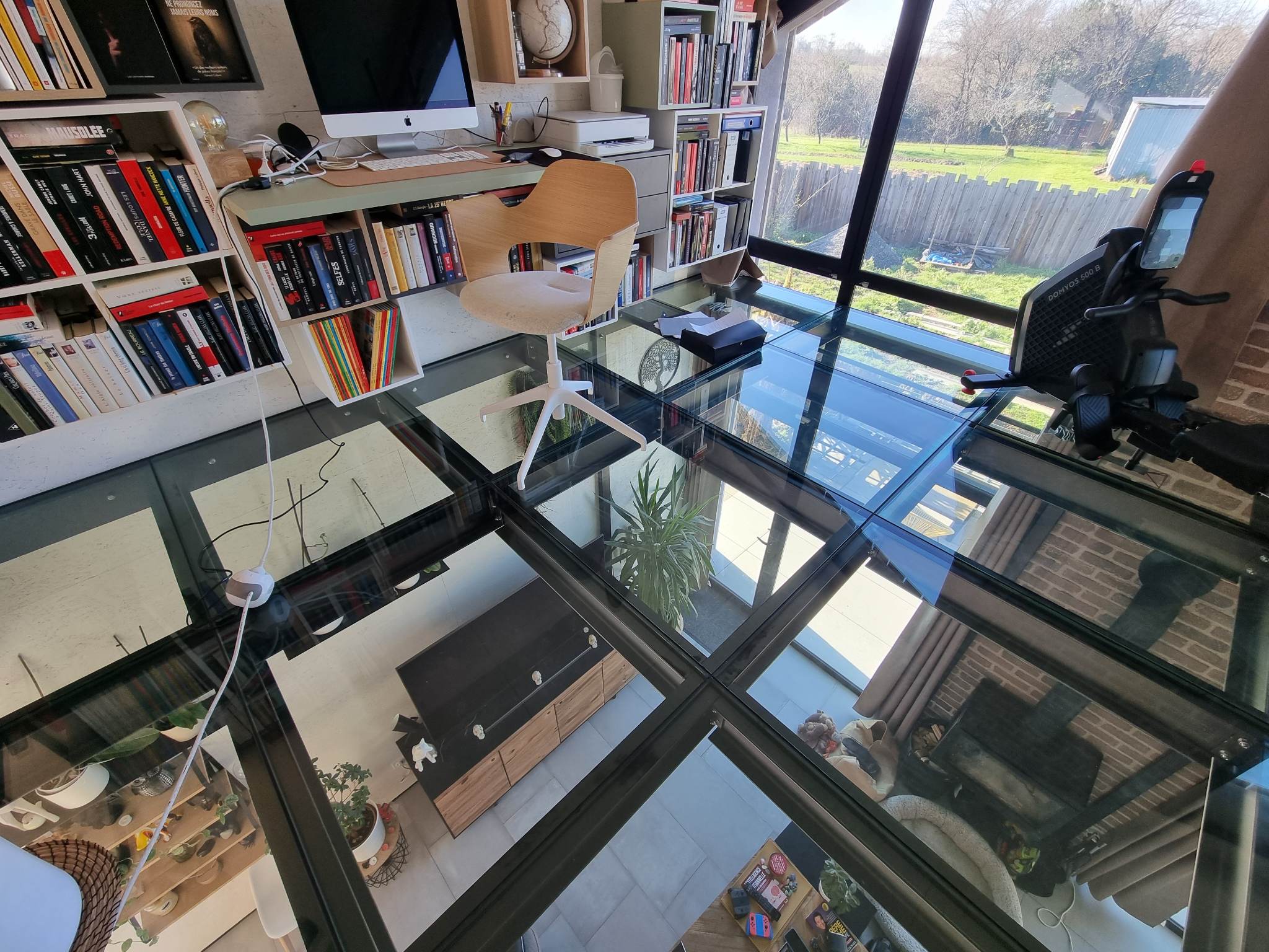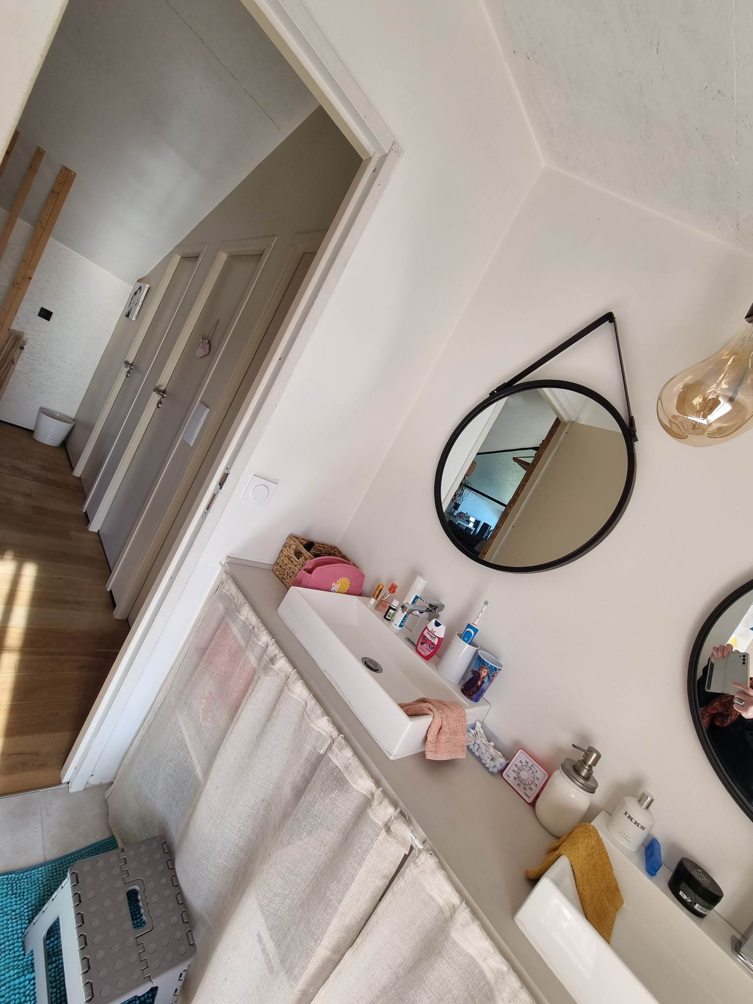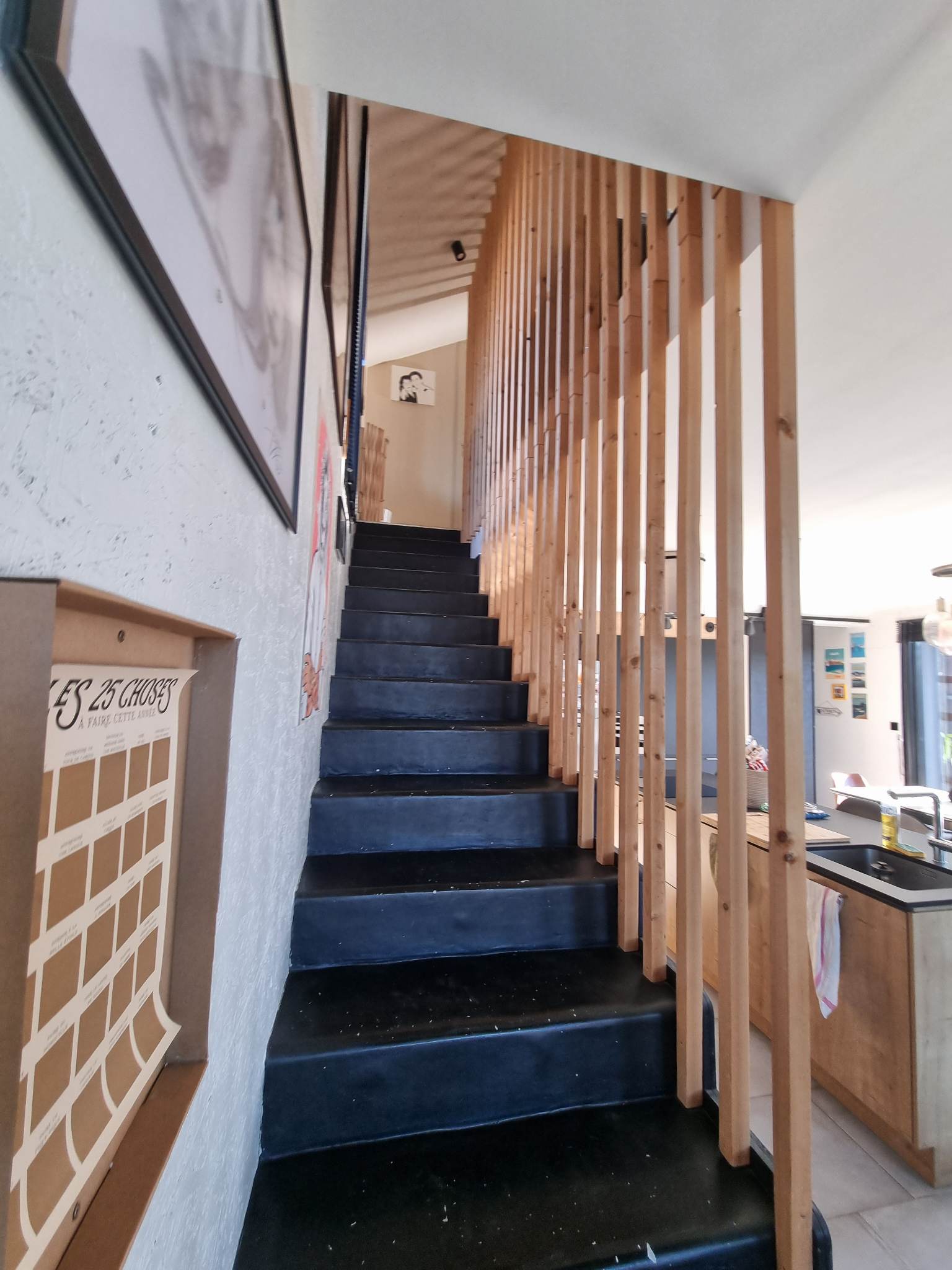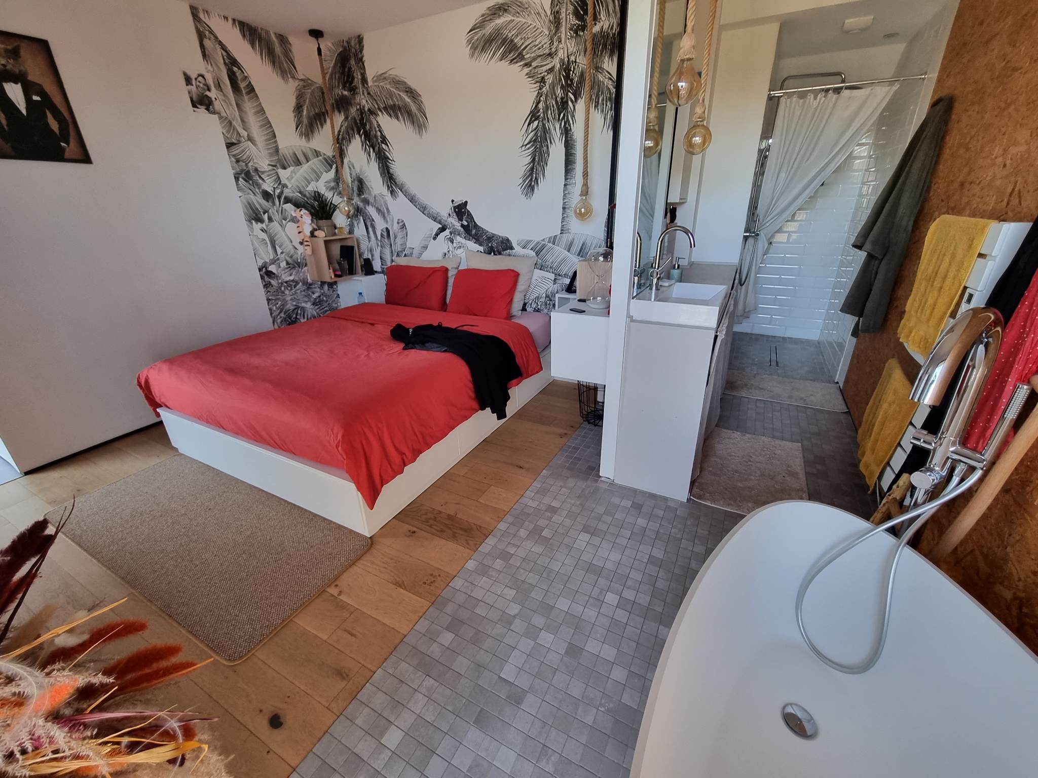 À l’étage, deux chambres identiques de 11m², une seconde salle d’eau attenante, un espace bureau , LA Mezzanine surplombant le séjour créent des espaces complémentaires modulables : bureau, salon lecture ou espace détente, chacun profitant d’une vue plongeante sur la pièce de vie.